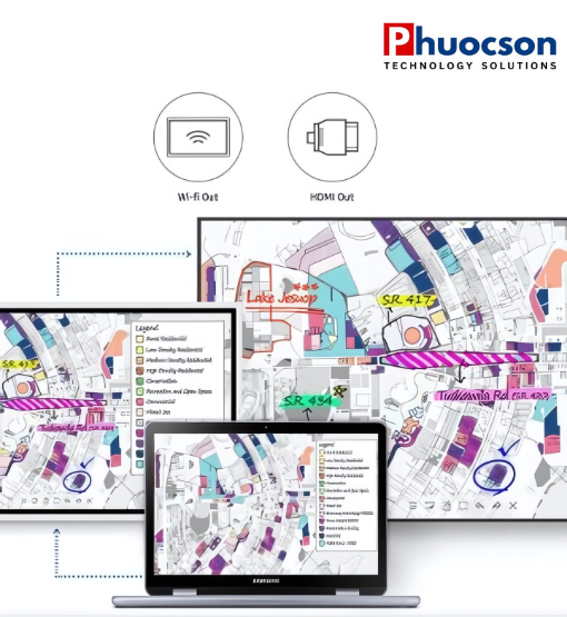 Với kết nối Wi-Fi hoặc đầu ra HDMI, bạn có thể ngay lập tức đưa mọi nội dung trên Samsung Flip sang một màn hình kỹ thuật số lớn hơn hẳn, ngay cả khi sử dụng thiết bị cá nhân. Giải pháp hoàn hảo để truyền tải trọn vẹn thông tin đến nhiều người, trong một quy mô buổi họp lớn.